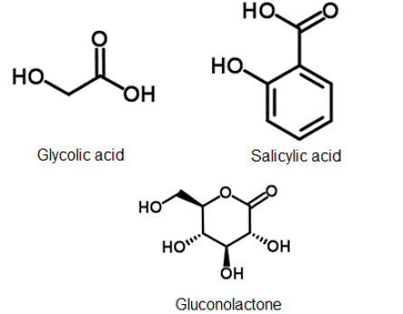 structure of AHA (glycolic acid), BHA (SA) and PHA (gluconolactone)